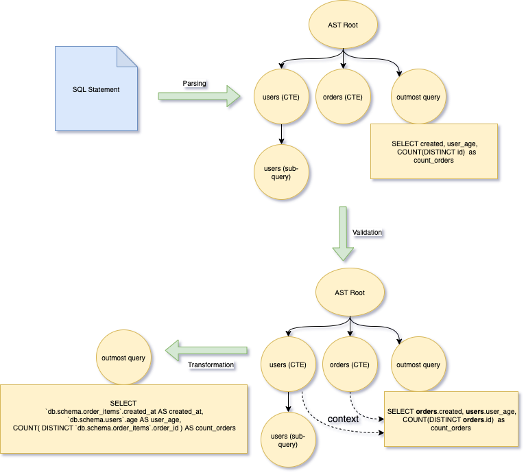 Single Origin parses SQL into AST (abstract syntax tree) based on Calcite which validates the AST with the standardized schema in the metadata store. During the validation process, the scope of each syntax node is derived and verified, ensuring a higher level of accuracy than parsing alone. When two or more nodes have the same name, the correct context for each is attached to the nodes by the validator. Additionally, if it is unclear which dataset a column is coming from, the validator can derive and extend the node's source prefix. With the correct context and source prefix, the underlying source for any node can be easily identified.