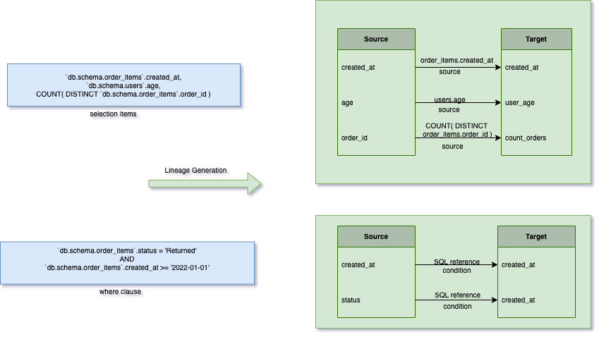 After the schema deriving, it processes all the selection items and generates the lineage edges for the corresponding field in the target table.