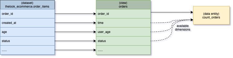 As shown above, the solid arrow represents the source lineage from the source field to the target field, while the dashed arrow implies that all dimensions from the view are available to the consumer when they consume the data entity with filters and group bys.