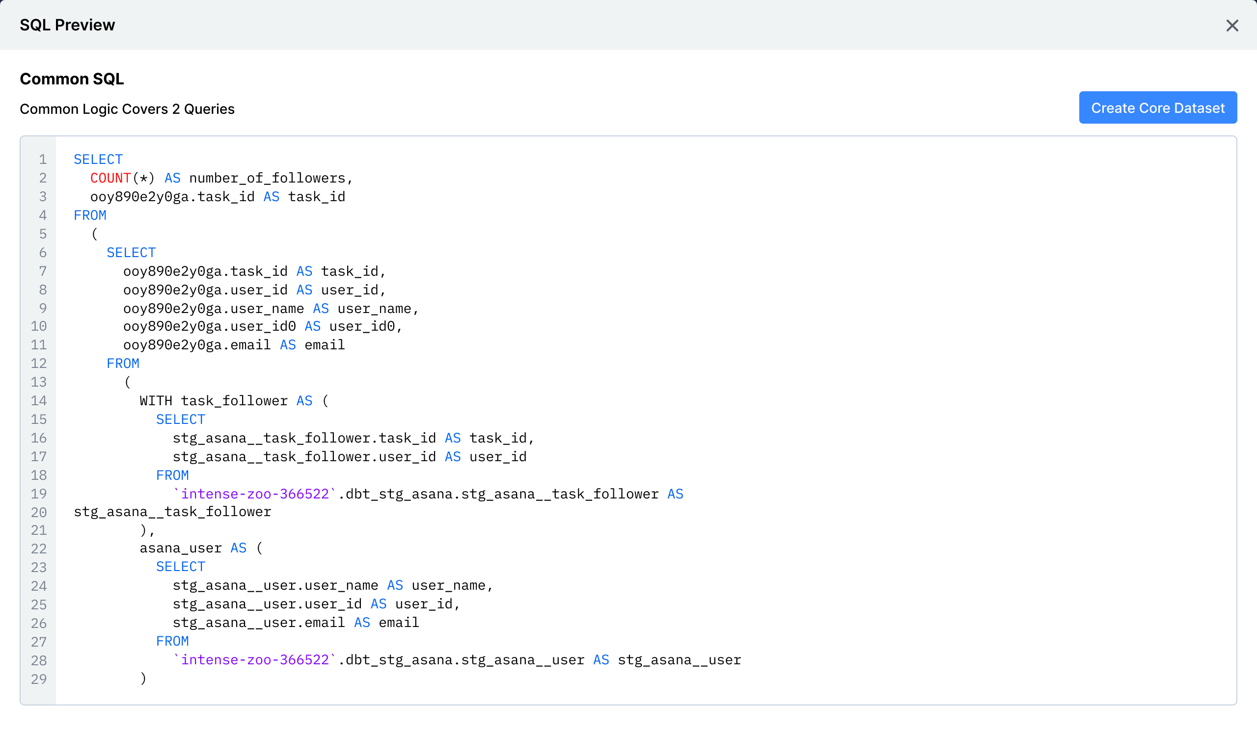 The expensive and redundant queries identified in your query audit make a great place to start optimizing. Unlike the traditional approach to improving query performance, optimizing your queries in Single Origin is programmatic and automated. Instead of chasing down granular query details and rewriting them by hand, you can create a Core Dataset, an optimized SQL query that extracts the common computation logic from your group of queries. Single Origin then serves your existing queries with this hyper-efficient dataset and can rewrite new incoming queries to utilize the common dataset on-the-fly.