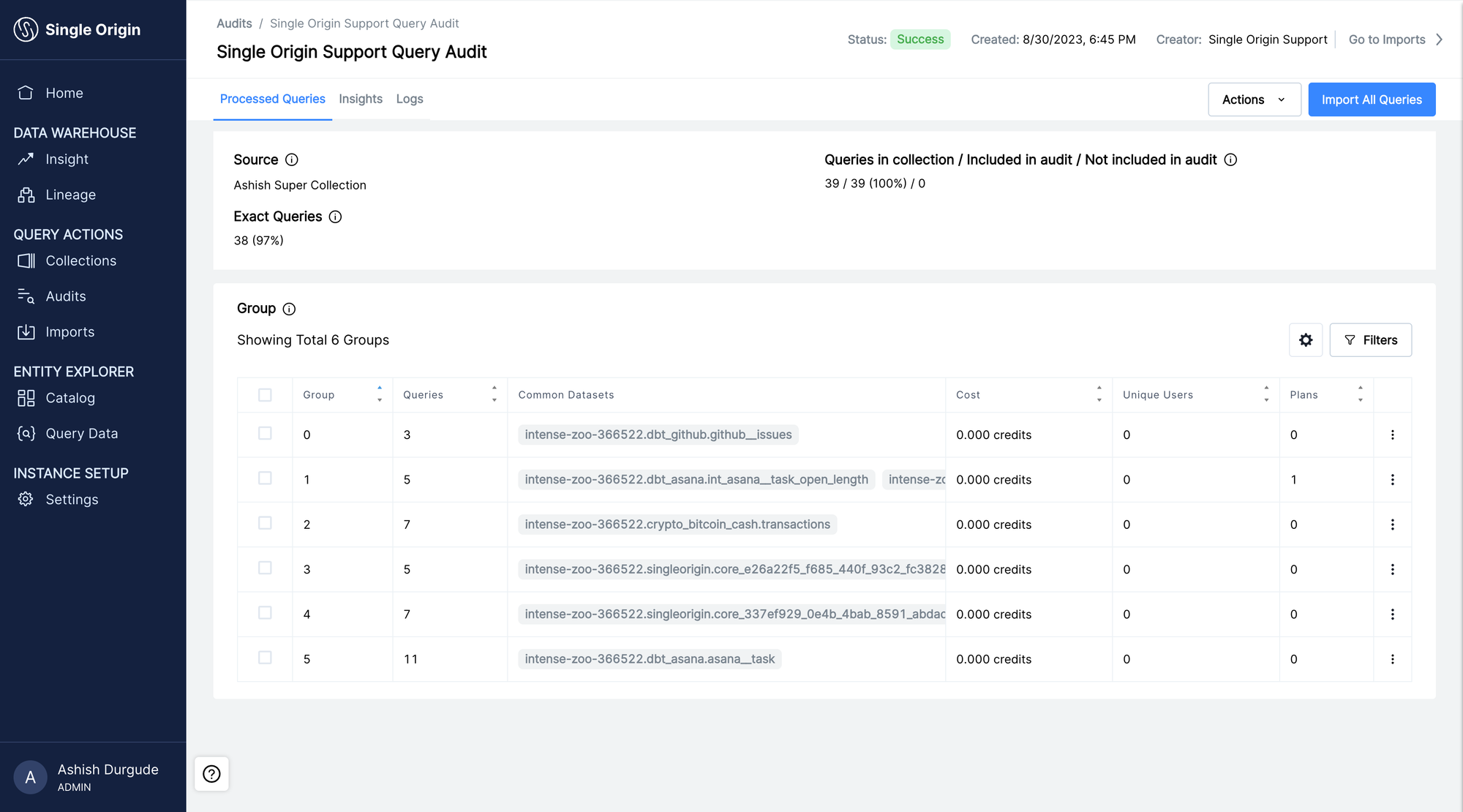 Then, perform a Query Audit on the collection, an operation that groups your queries based on their underlying logic. Query Audits reveal insights into cost, performance, and usage patterns. In minutes, you can bypass dozens of hours of tagging, fingerprinting, and analysis.
