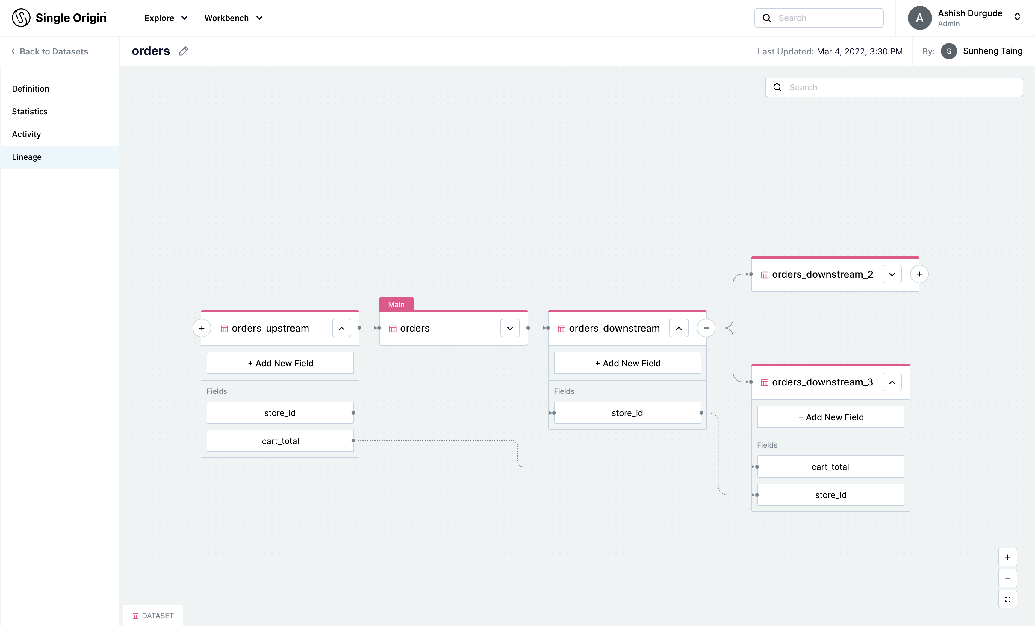 You can interface with field-level lineage through a set of APIs or by visualizing it in Single Origin’s UI. APIs are useful for users that need lineage data to perform other actions such as compliance and quality checks. The UI allows technical and non-technical users to explore relationships of fields across many views and datasets.
