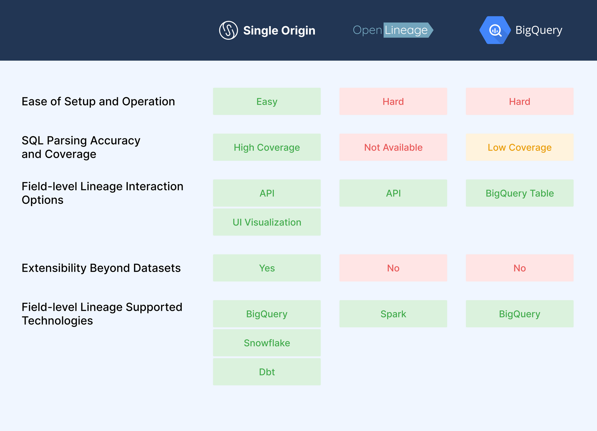 We will compare Google Cloud, OpenLineage, and Single Origin across five categories: