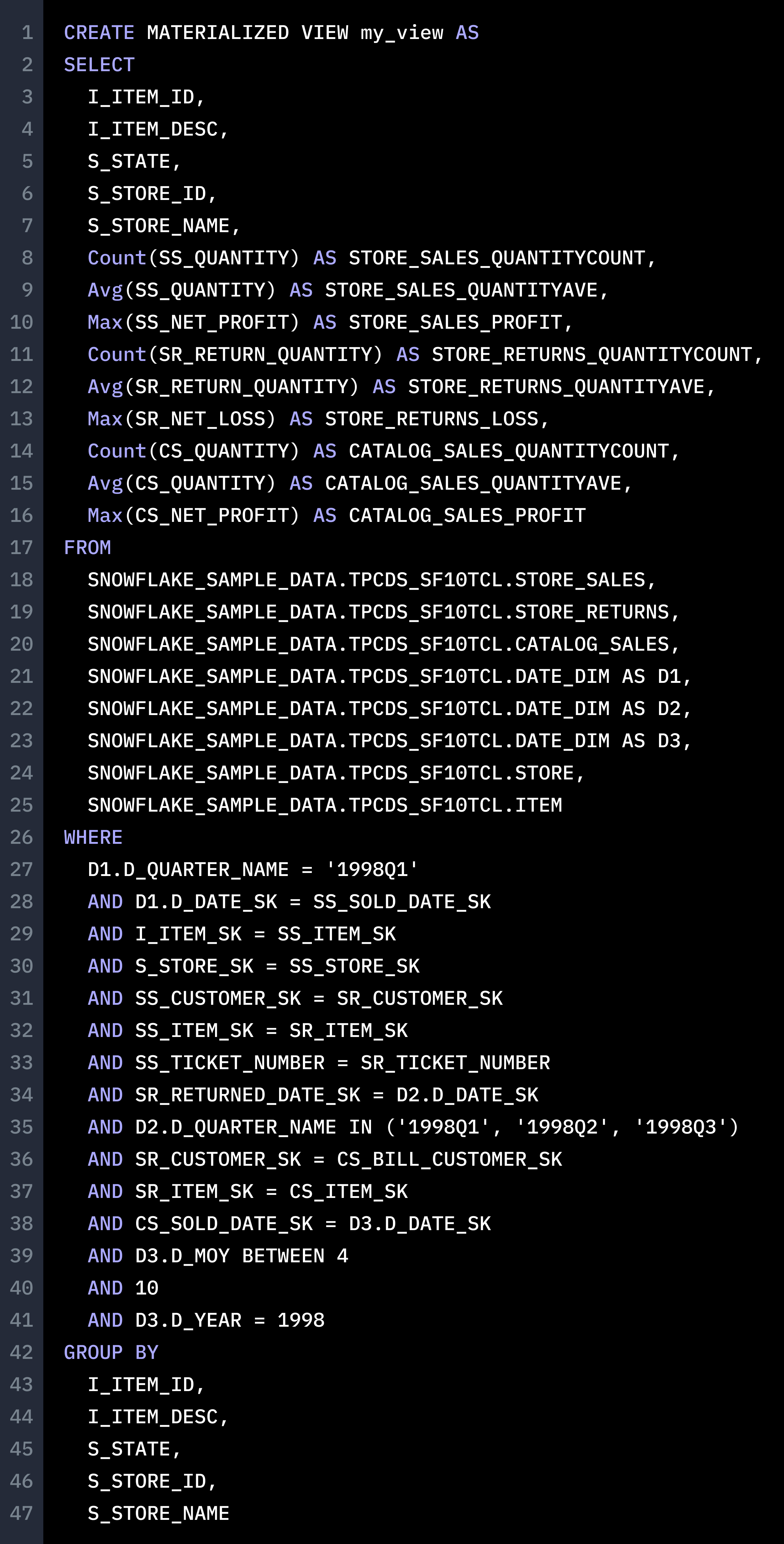We’ll focus on two primary tasks that Single Origin routinely performs - identifying semantic equivalence and generating common computation logic. For the unfamiliar, common computation logic refers to shared computation components, like data loading, table joins, aggregations, etc., across different queries. Extracting this logic from a group of similar queries and refactoring them to rely on the common computation logic can result in significant improvements in cost and performance, much like a materialized view. Semantic equivalence is necessary to perform deduping and recognizing when old data assets can be reused (such as when generating common computation logic).